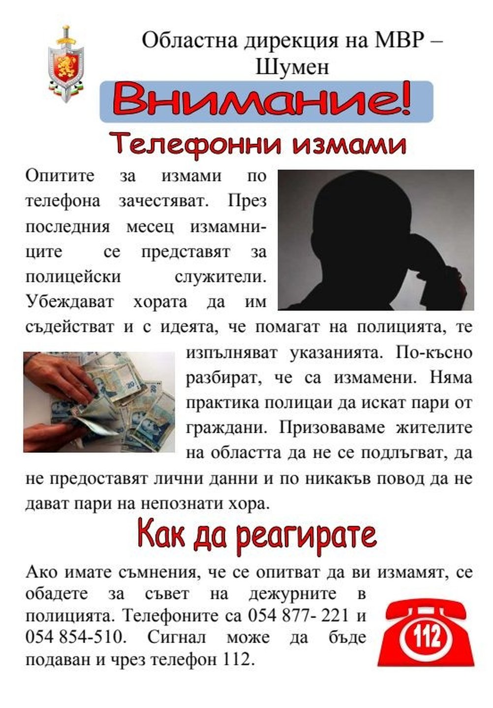 От полицията в Шумен съобщиха още, че днес опитите за измами в областта продължават. На стационарни телефони звънят мъже, които се представят за полицаи. Обясняват на хората, че телефонни измамници разполагат със списък, по който звънят и се мъчат да въведат хората в заблуждение. Опитват се да ги убедят да съдействат при залавянето им. Разпитват ги за налични суми в домовете им и дали имат спестявания в банките. До момента на всички, на които са позвънили, са разбрали, че става дума за измамници, които се представят за полицаи.