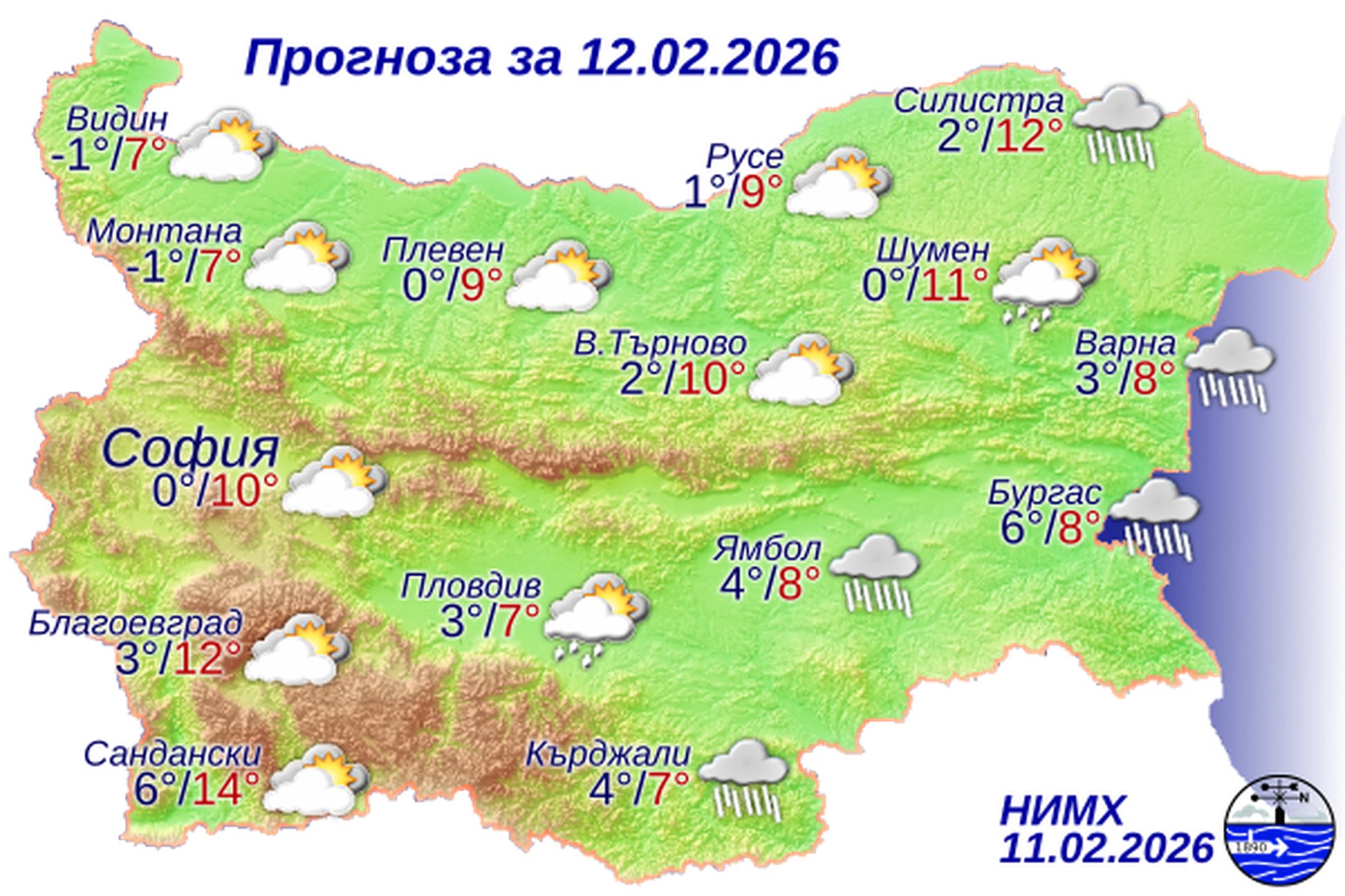 През нощта облачността от югозапад ще се увеличи и след полунощ в Южна България ще завали дъжд, по-значителен в Родопите. В Източна България ще духа слаб до умерен южен вятър. Минималните температури ще бъдат между 0° и 5°, в София – около 0°. Утре в по-голямата част от Южна България, а след обяд в Източна ще има валежи от дъжд. През деня облачността, главно над Западна и Централна България, временно ще се разкъса. В Източна България и по долината на Струма ще духа слаб до умерен южен вятър. Преобладаващите максимални температури ще бъдат между 7° и 12°, в София – около 10°. През нощта срещу петък валежите и в Източна България ще спрат, но от югозапад ще започнат нови, които след полунощ ще обхванат Южна България.