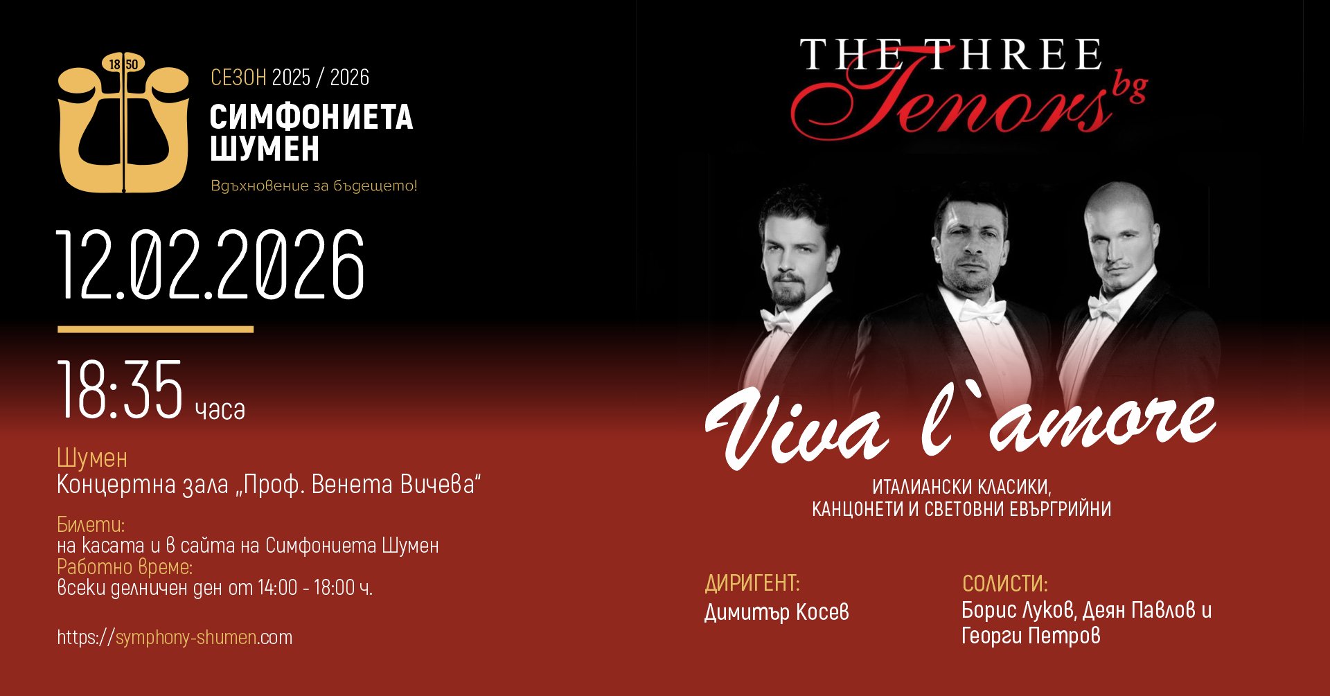 Симфониета - Шумен кани публиката на специална вечер, посветена на любовта, страстта и италианската музикална традиция. Концертът „Viva l’amore“ събира на една сцена популярното вокално трио The Three Tenors.bg (Тримата български тенори), които ще изпълнят подбрана програма от италиански класики, канцонети и световни евъргрийни.