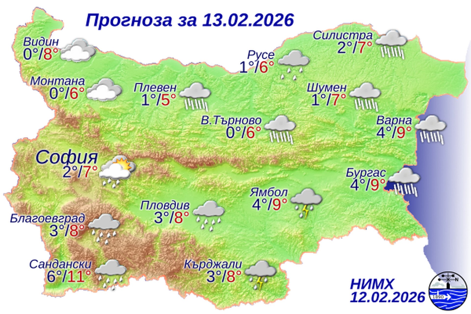 През следващото денонощие ще бъде облачно. През нощта на места в северозападните райони ще е мъгливо. След полунощ от югозапад ще започне да вали дъжд. Валежите през деня ще обхванат по-голямата част от страната. Значителни по количество ще бъдат те на много места в южните райони. В югоизточните части от страната ще има и гръмотевична дейност. Ще духа до умерен, в източните райони временно силен вятър от север-североизток, в Дунавската равнина – от запад. В повечето места минималните температури ще бъдат между 0° и 5°, за София – около 2°, максималните – между 5° и 10°, за София – около 7°.