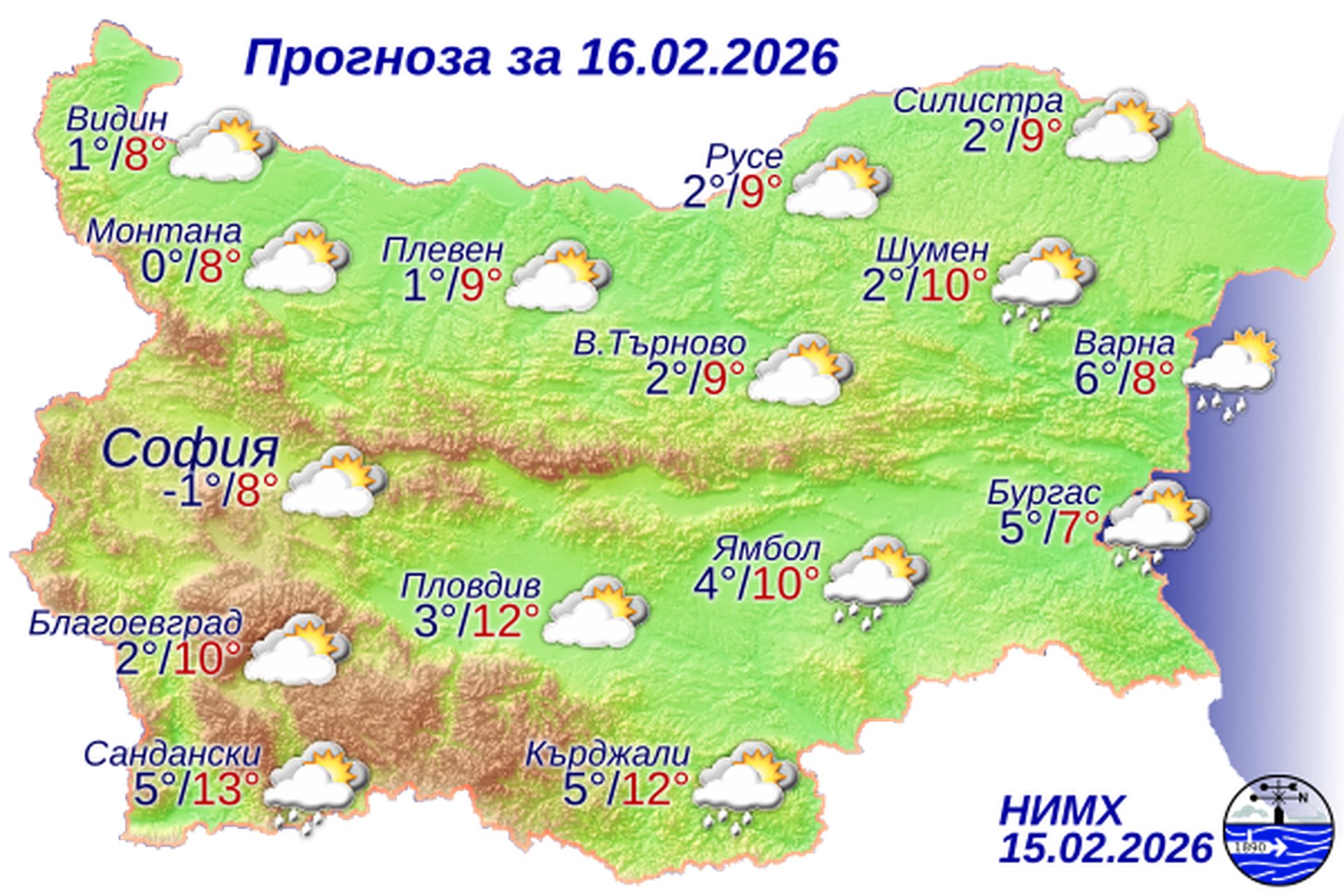 През нощта на места в Югозападна България и източните райони от страната все още ще превалява дъжд, в планинските райони – слаб сняг, но до сутринта валежите ще спрат. Ще духа слаб, в Дунавската равнина – до умерен западен вятър и с него ще продължи да нахлува студен въздух. Минималните температури ще са между минус 1° и 4°, в София – около минус 1°. Утре облачността ще е разкъсана, след обяд над източната половина от страната – предимно значителна и на места в югоизточните райони ще превали дъжд. Максималните температури ще са между 8° и 13°, в София - около 8°.