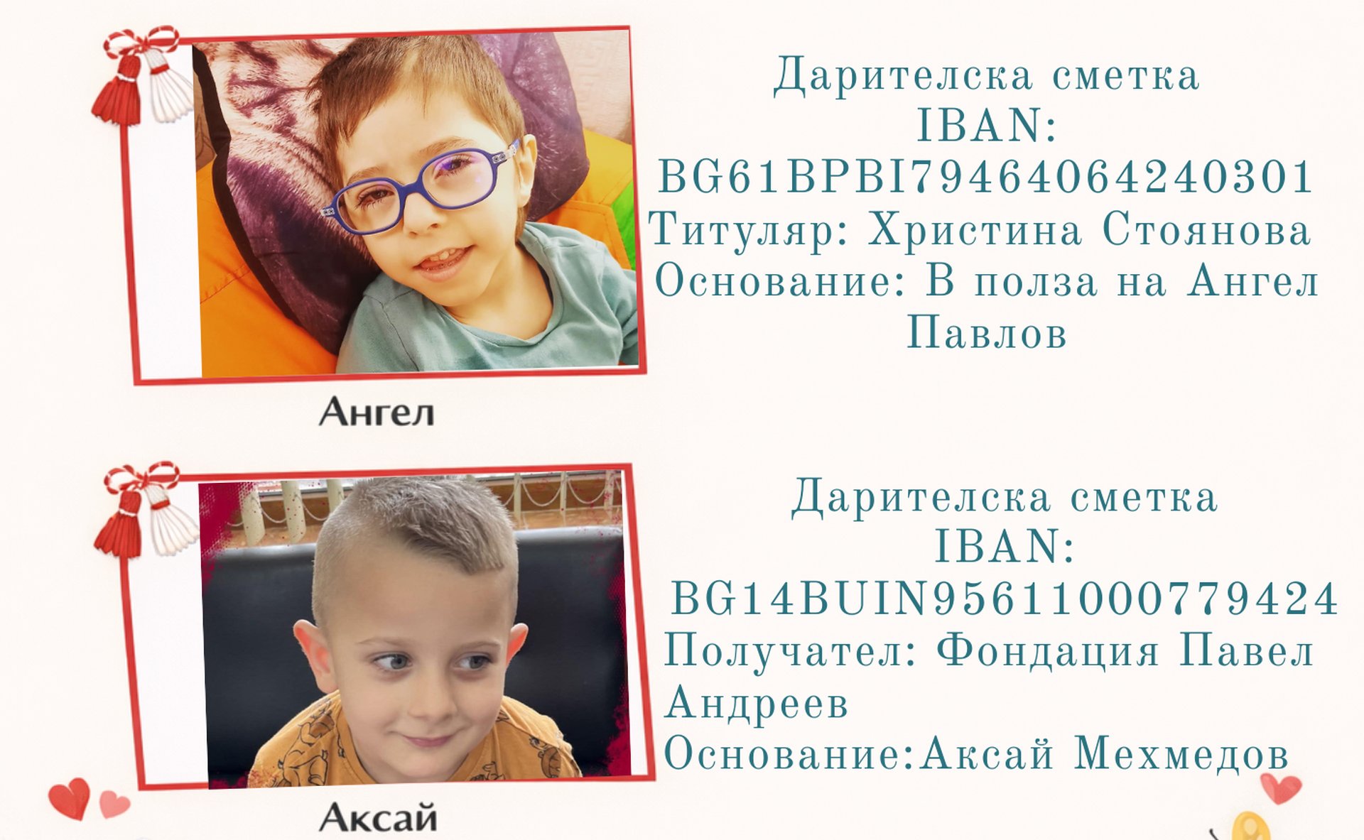 Събраните средства ще бъдат дарени за лечението на 7-годишния Ангел от Шумен и 6-годишния Аксай от Търговище.
