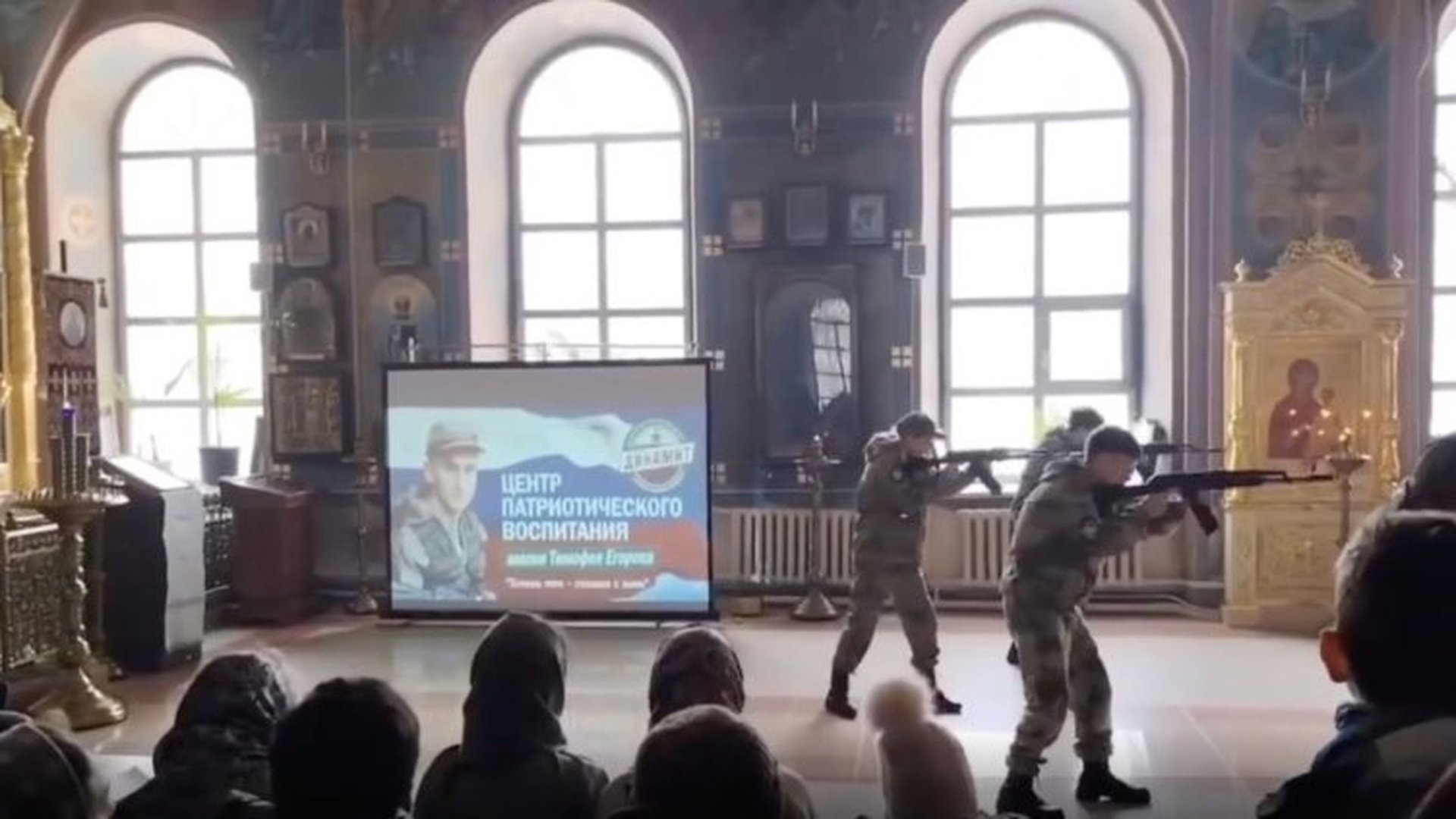 На 15 февруари в общността на църквата във ВКонтакте беше публикувана публикация за Деня на православната младеж. Прикачен е видеоклип от изпълнение на ученици от Патриотичния образователен център "Динамит". На него се виждат тийнейджъри в камуфлажни униформи, които практикуват стрелба с автоматична пушка и военен ръкопашен бой пред олтара. Младите мъже носят оръжия (дали са бойни или не, не се уточнява); във видеото се чуват изстрели.