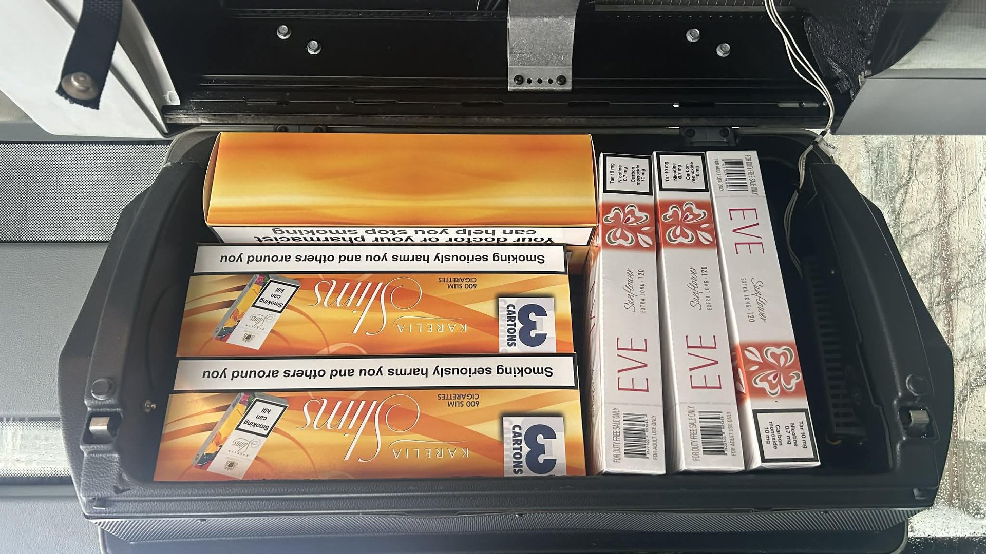 В автобуса намерили 3600 къса цигари марка Карелия слимс и 1800 къса цигари марка Еве. Цигарите били без български бандерол и били иззети.
