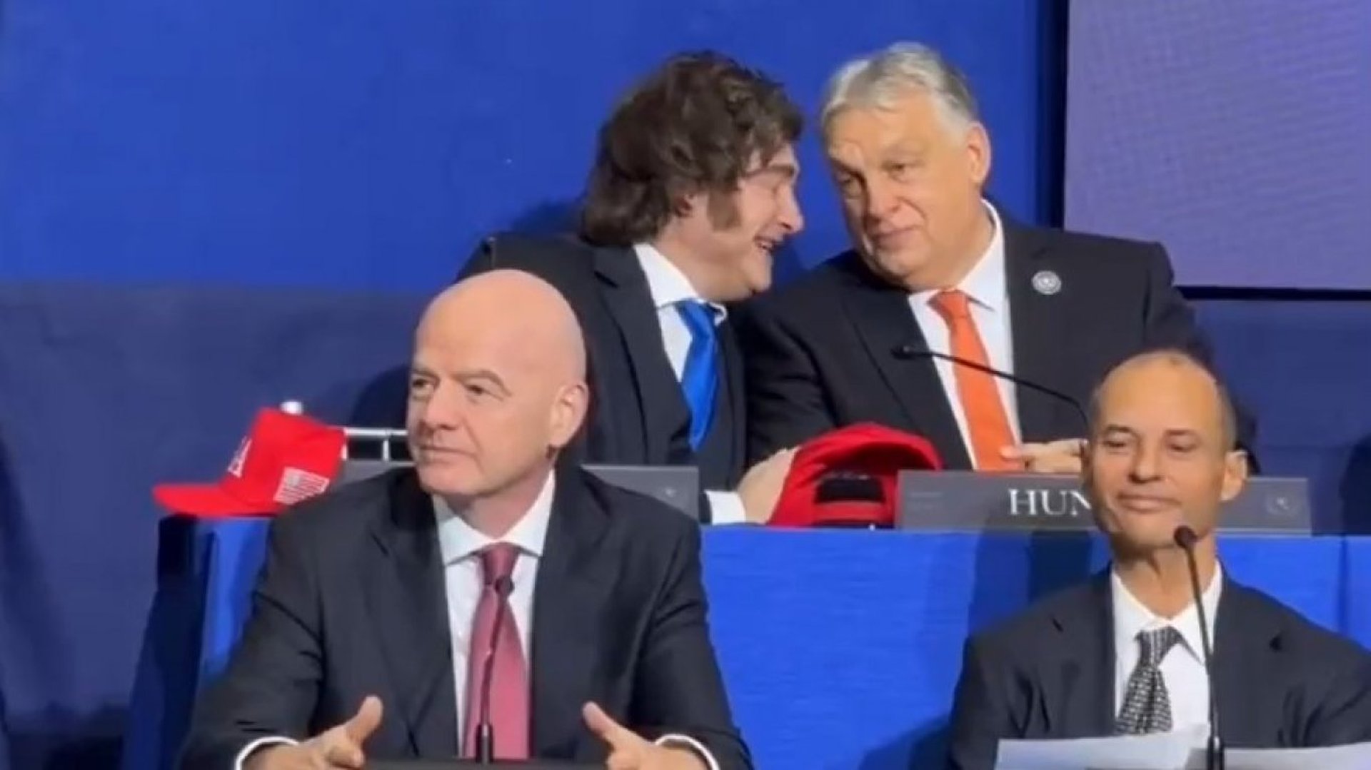 Милей и Орбан, седнали един до друг, демонстрираха и добри приятелски отношения. Камера показа как двамата разговарят дружески, смееят се, а Милей прегръща през рамо Орбан и приятелски го потупва по гърба.