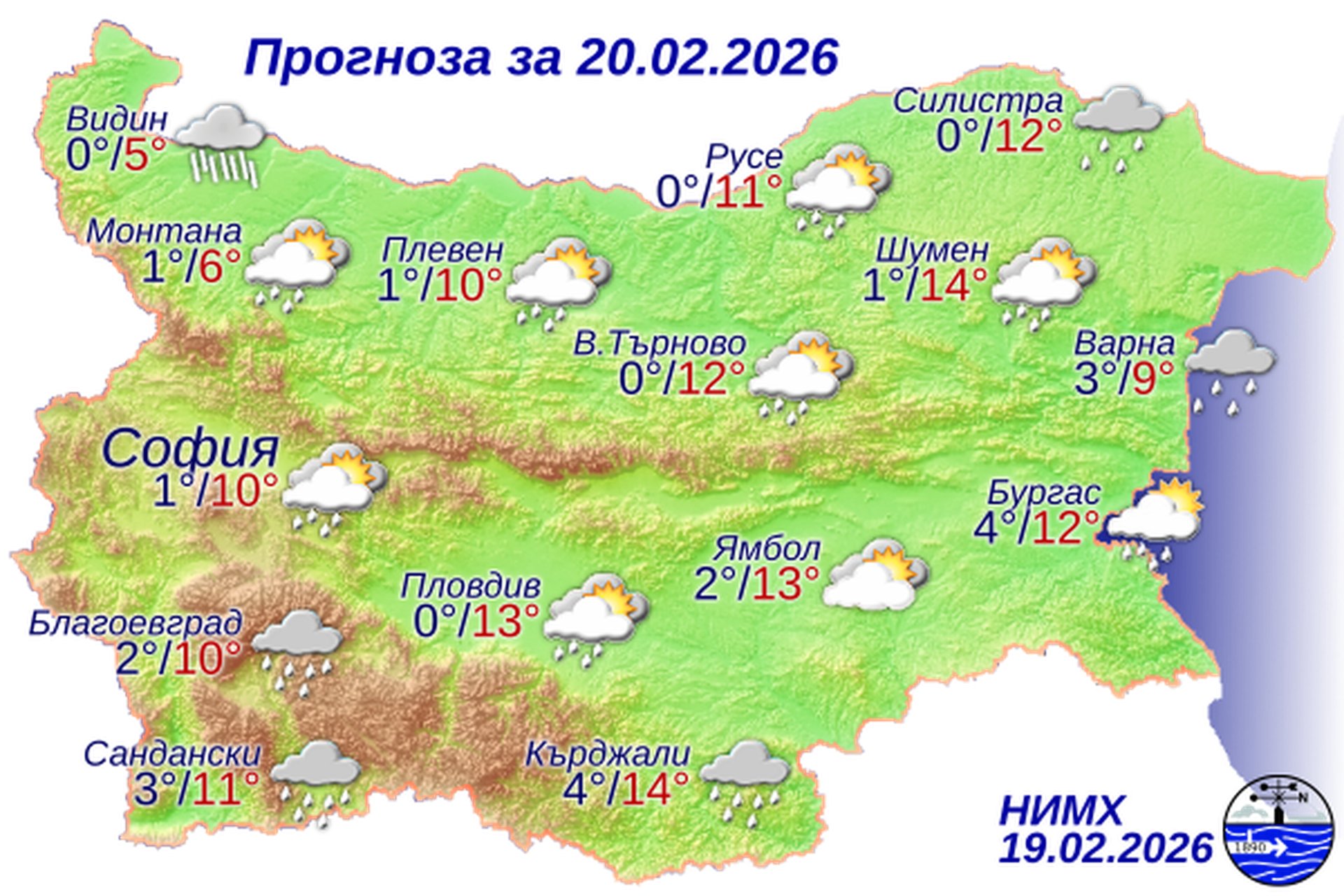 рез нощта облачността от запад ще продължи да се увеличава. Ще духа слаб до умерен вятър от изток-югоизток, в Източна България - от юг-югозапад. Минималните температури в повечето места ще бъдат между минус 1° и 4°, за София – около 1°. Утре ще преобладава облачно време. Сутринта на много места в западната половина от страната ще има валежи от дъжд, в планините над 1400-1500 метра надморска височина – от сняг. След обяд и през нощта срещу събота валежите ще обхващат централните и източните райони. По-значителни по количество ще са валежите в Рило-Родопската област, а в районите със снежна покривка ще има условия за заледявания. В Източна България ще духа умерен и временно силен вятър от юг-югозапад, а в останалите райони от страната вятърът ще е слаб до умерен от изток-югоизток. Максималните температури ще бъдат между 8° и 13°, в източните райони – до 15°, в Северозападна България - между 5° и 8°, за София – около 10°.