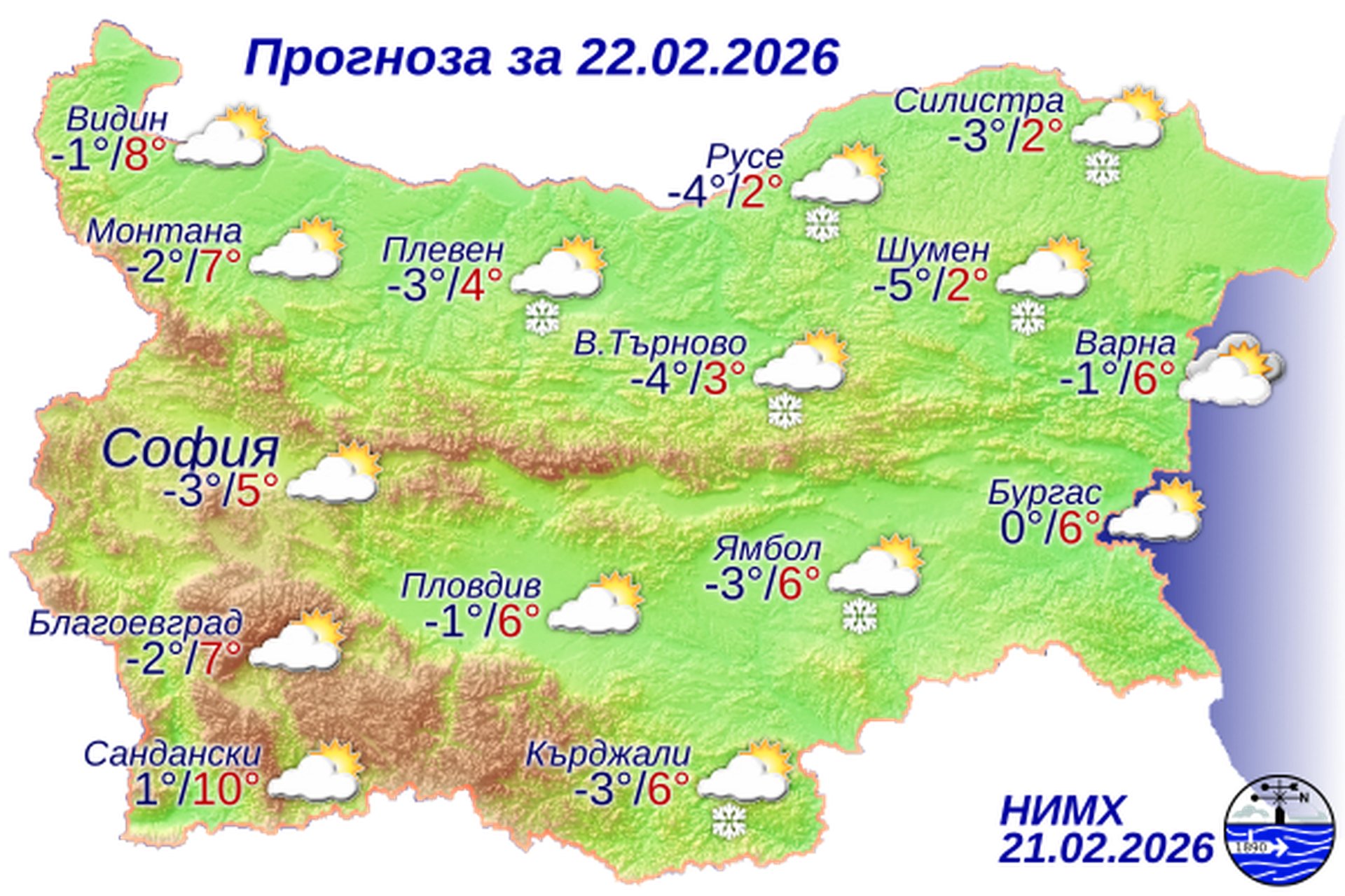 По Черноморието до обяд облачността ще е значителна и на отделни места все още ще превалява сняг. След обяд валежите ще спрат и облачността ще се разкъсва и ще намалява. Ще духа умерен вятър от север-северозапад. Максималните температури ще бъдат 5°-7°. Температурата на морската вода е 5°-6°. Вълнението на морето ще бъде 3-4 бала.