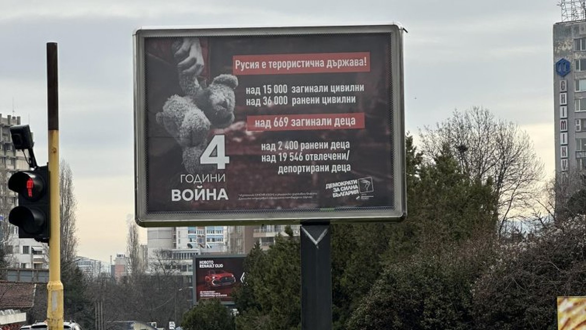 На улицата срещу посолството бе поставен билборд с надпис "Русия е терористична държава!", на който са изписани данни за броя на загиналите и ранените цивилни, както и за убитите и отвлечените деца за четирите години от началото на войната.