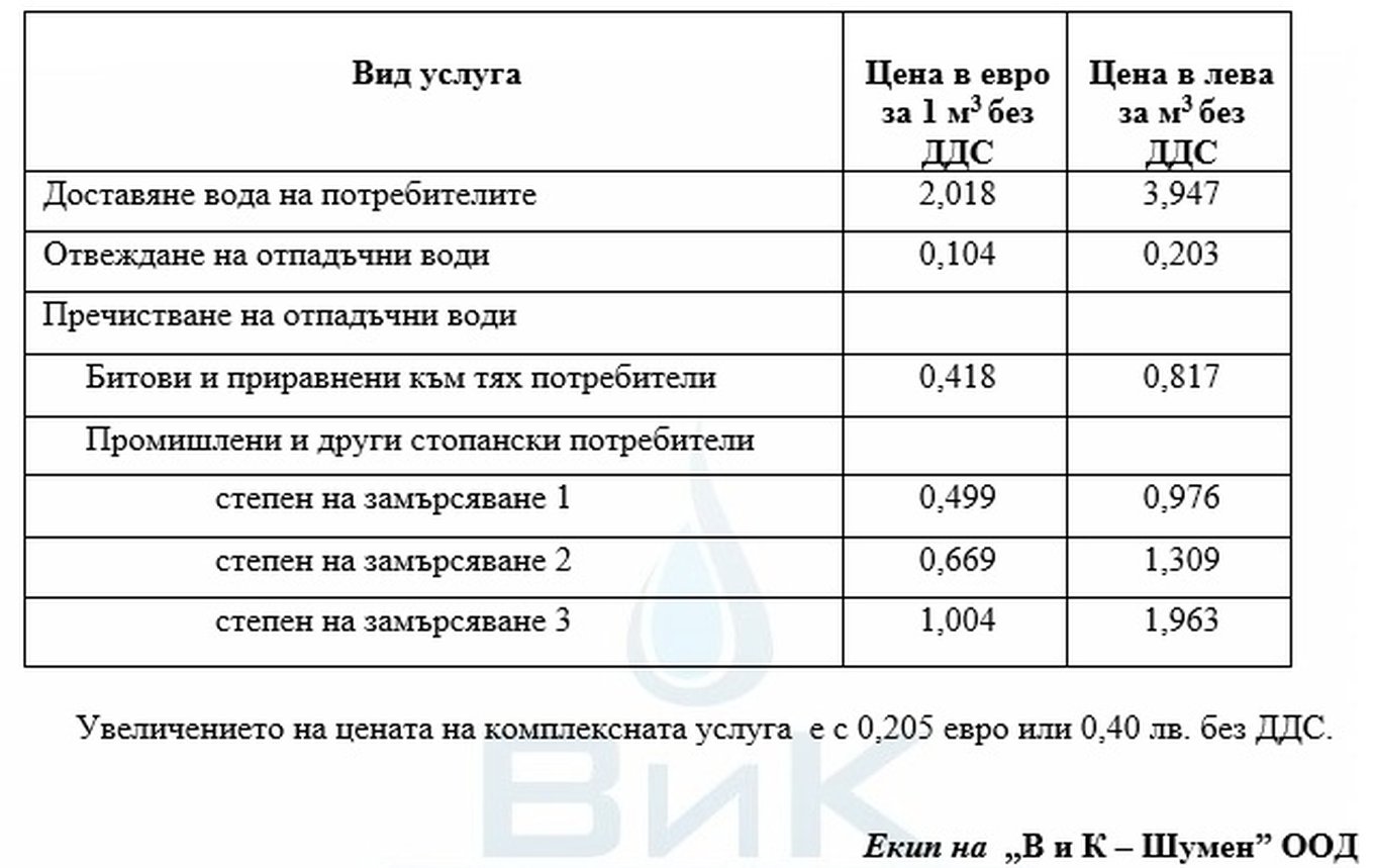 „Актуализацията е във връзка с одобрените от КЕВР бизнес планове за развитието и дейността на водните дружества. Промяната на цените на ВиК услугите е необходима с оглед покриване оперативните разходи на ВиК дружеството, включително за заплати, осигуровки, ел. енергия, както и изпълнението на инвестиционната програма, чиято основна цел е подобряване качеството и сигурността на водоснабдителните и канализационни услуги“, посочват от ВиК – Шумен.