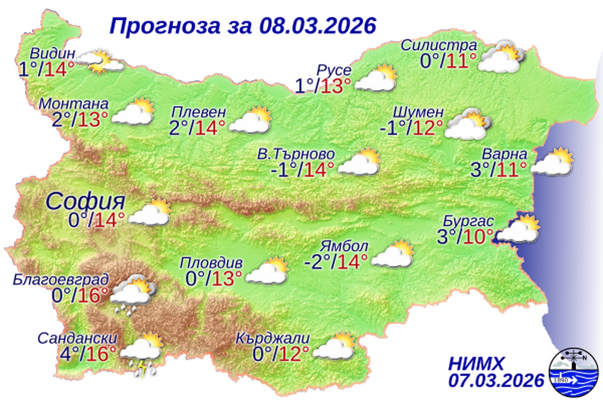 По Черноморието ще е предимно слънчево. Високата облачност временно ще се увеличава. Ще духа слаб до умерен вятър от изток-североизток. Максималните температури ще бъдат 10°-11°. Температурата на морската вода е 6°-8°. Вълнението на морето ще бъде 2-3 бала.