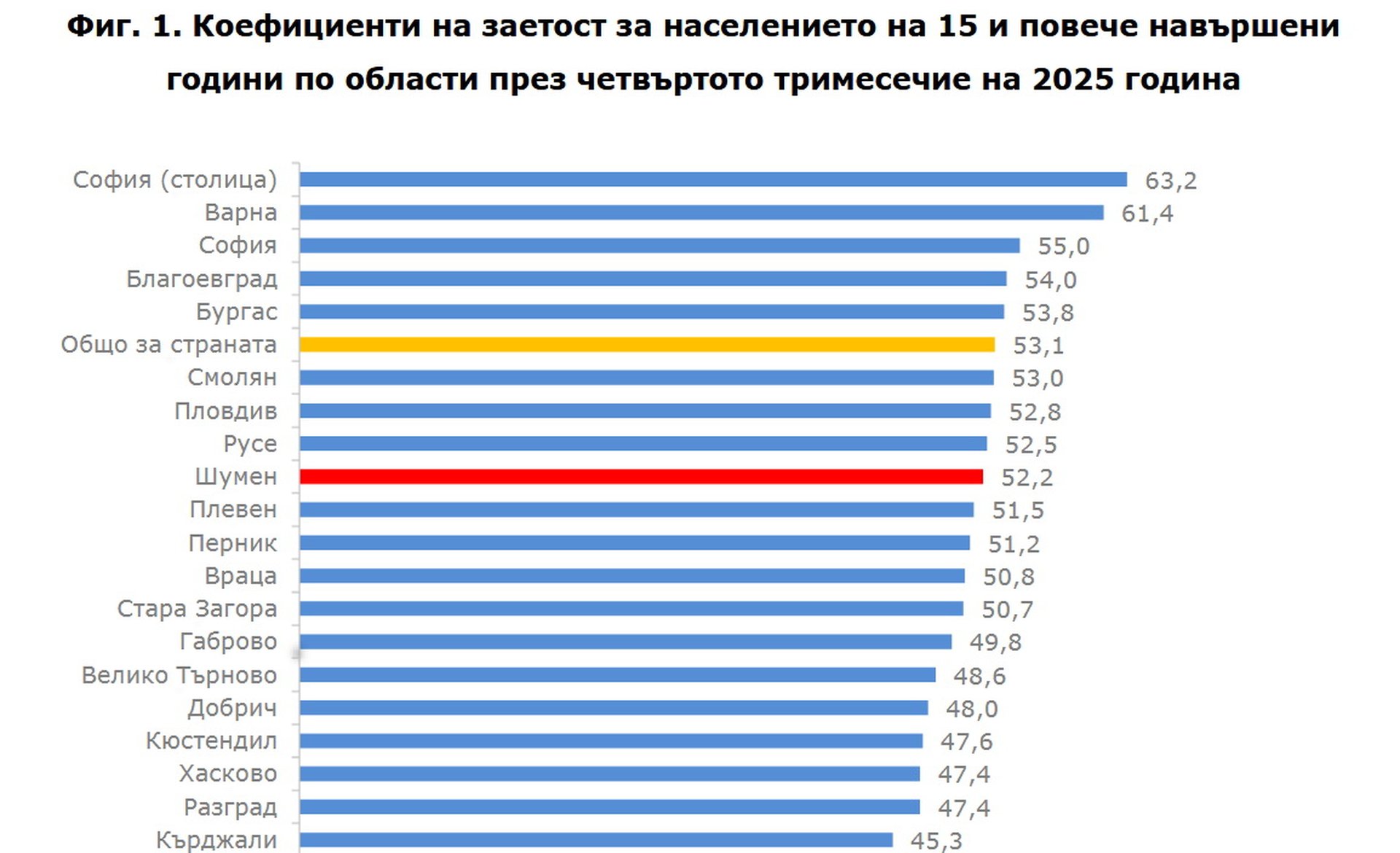Коефициентът на заетост за населението на 15 и повече навършени години в областта е 52,2% и е по-нисък от средния за страната, който е 53,1%.