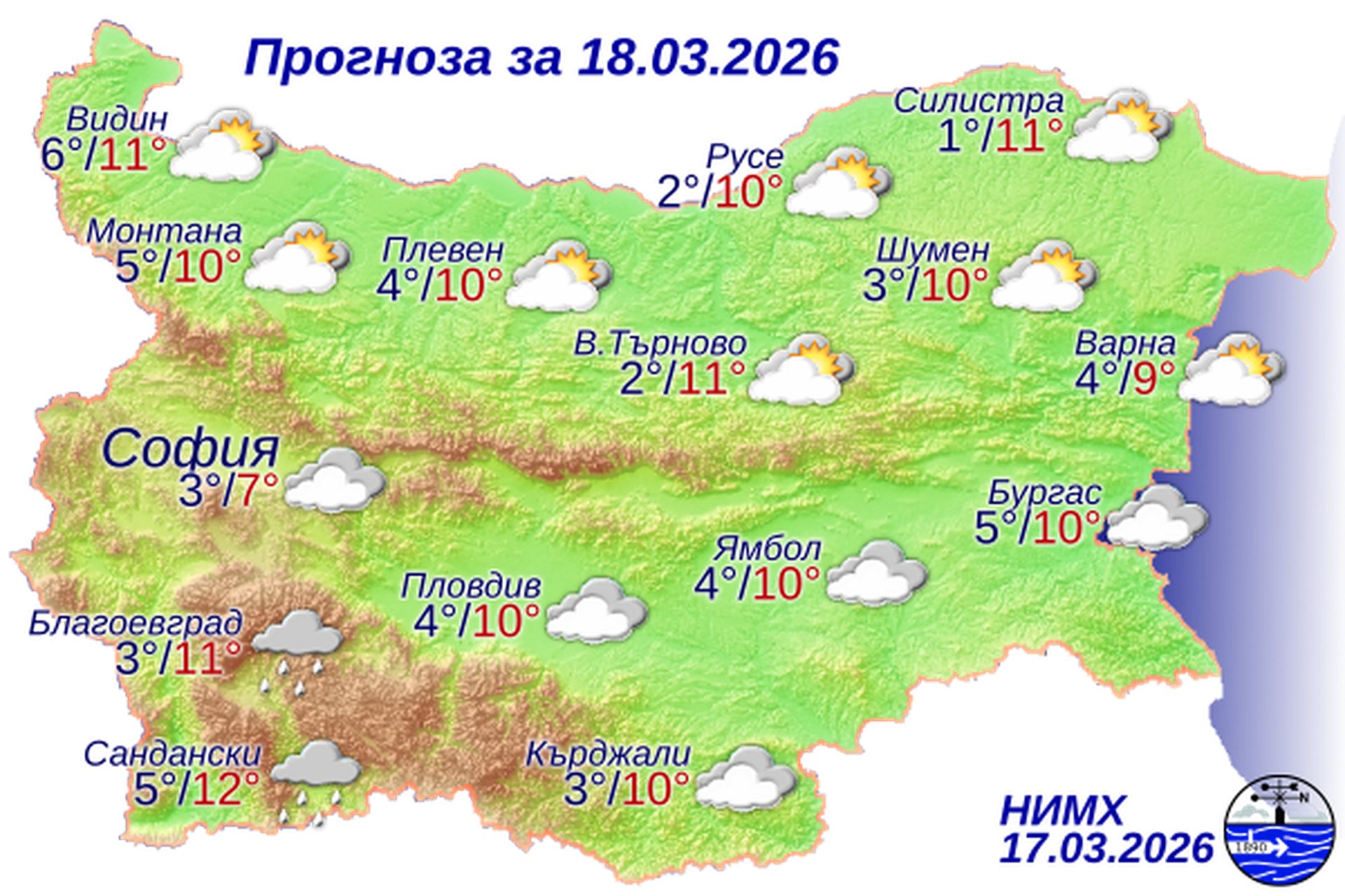 По Черноморието ще бъде предимно облачно. Ще духа умерен до силен вятър от изток-североизток. Максималните температури ще бъдат 8°-10°, близки до температурата на морската вода. Вълнението на морето ще бъде 2-3 бала.