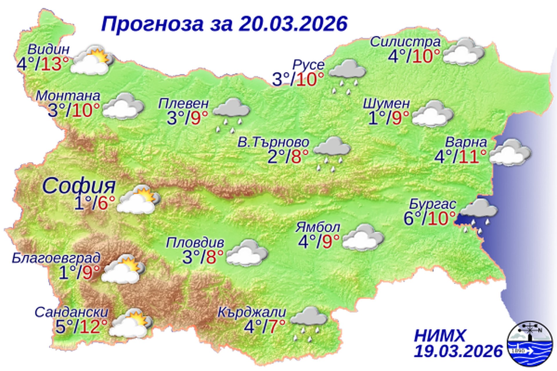 По Черноморието ще бъде облачно. Главно по южното крайбрежие ще има слаби валежи от дъжд. Ще духа умерен до силен вятър от север-североизток. Максималните температури ще бъдат между 8° и 11°. Температурата на морската вода е 7°-8°. Вълнението на морето ще бъде 3-4 бала.