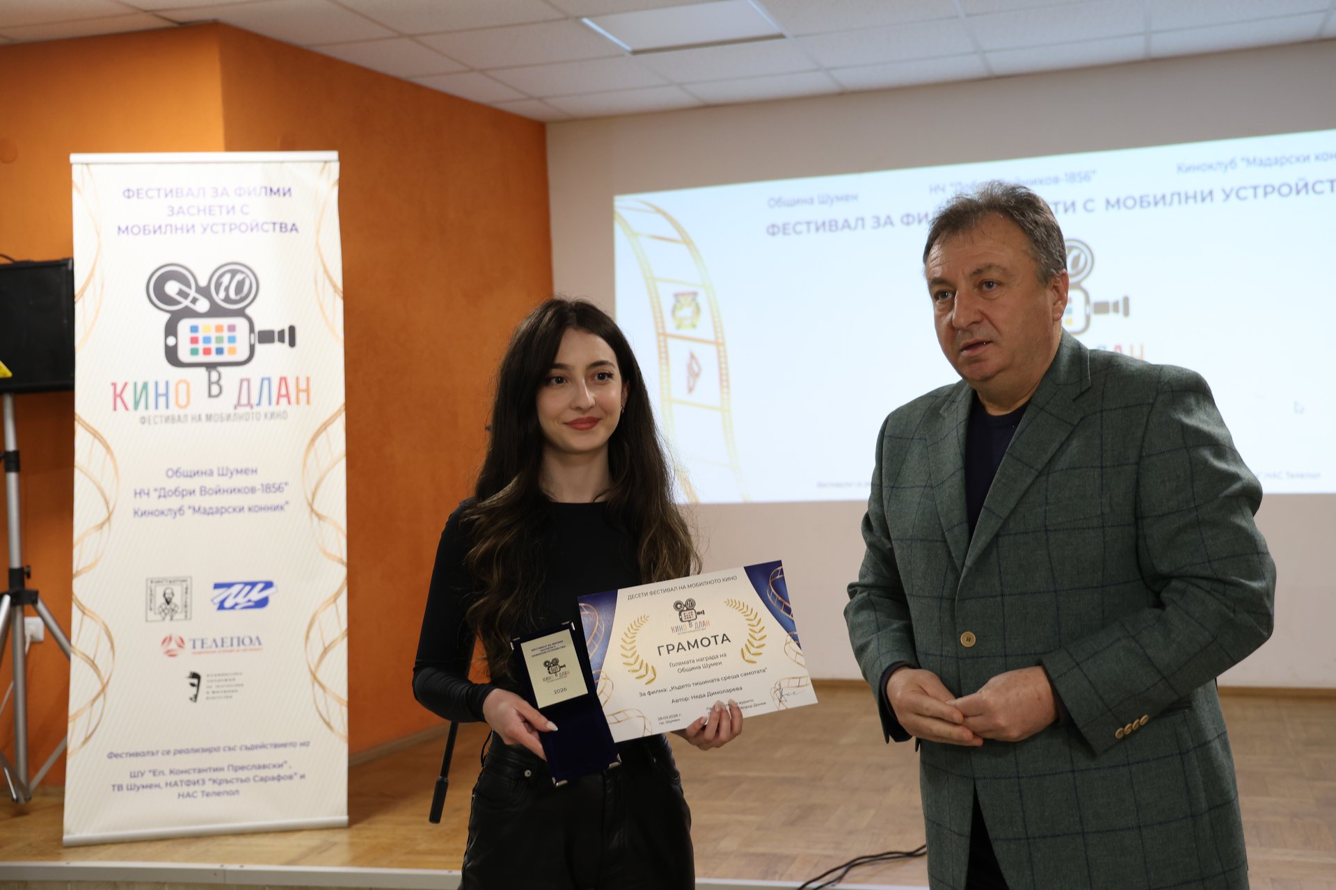 Филмът „Където тишината среща самотата“ на Неда Димоларева спечели първата награда на Х издание на фестивала за филми, създадени с мобилен телефон, „Кино в длан“. Отличието плакет, грамота и ваучер за 1000 евро, осигурено от Община Шумен, бе връчено на победителката от кмета Христо Христов, съобщиха от пресцентъра на НЧ „Добри Войников“, което е домакин и организатор на събитието.