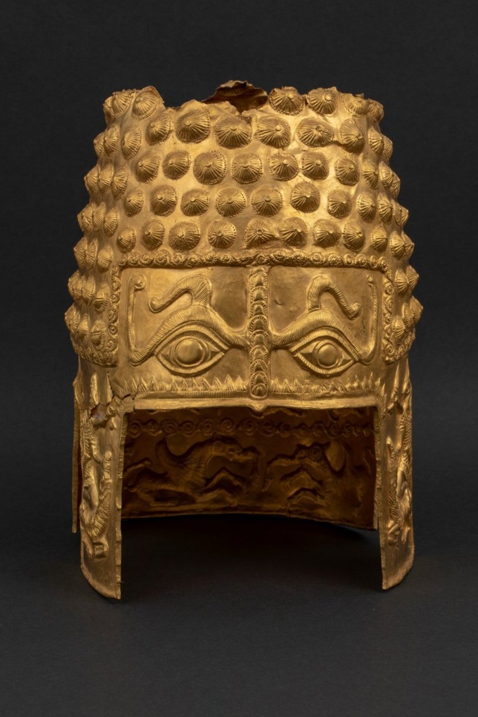 Крадците са избягали с три дакийски златни гривни, датиращи от около 50 г. пр.н.е., както и с "Шлемът от Коцофенещ" от 5-и век пр.н.е. - исторически важен артефакт, всички заети от Националния исторически музей на Румъния в Букурещ. Снимка: АП/БТА