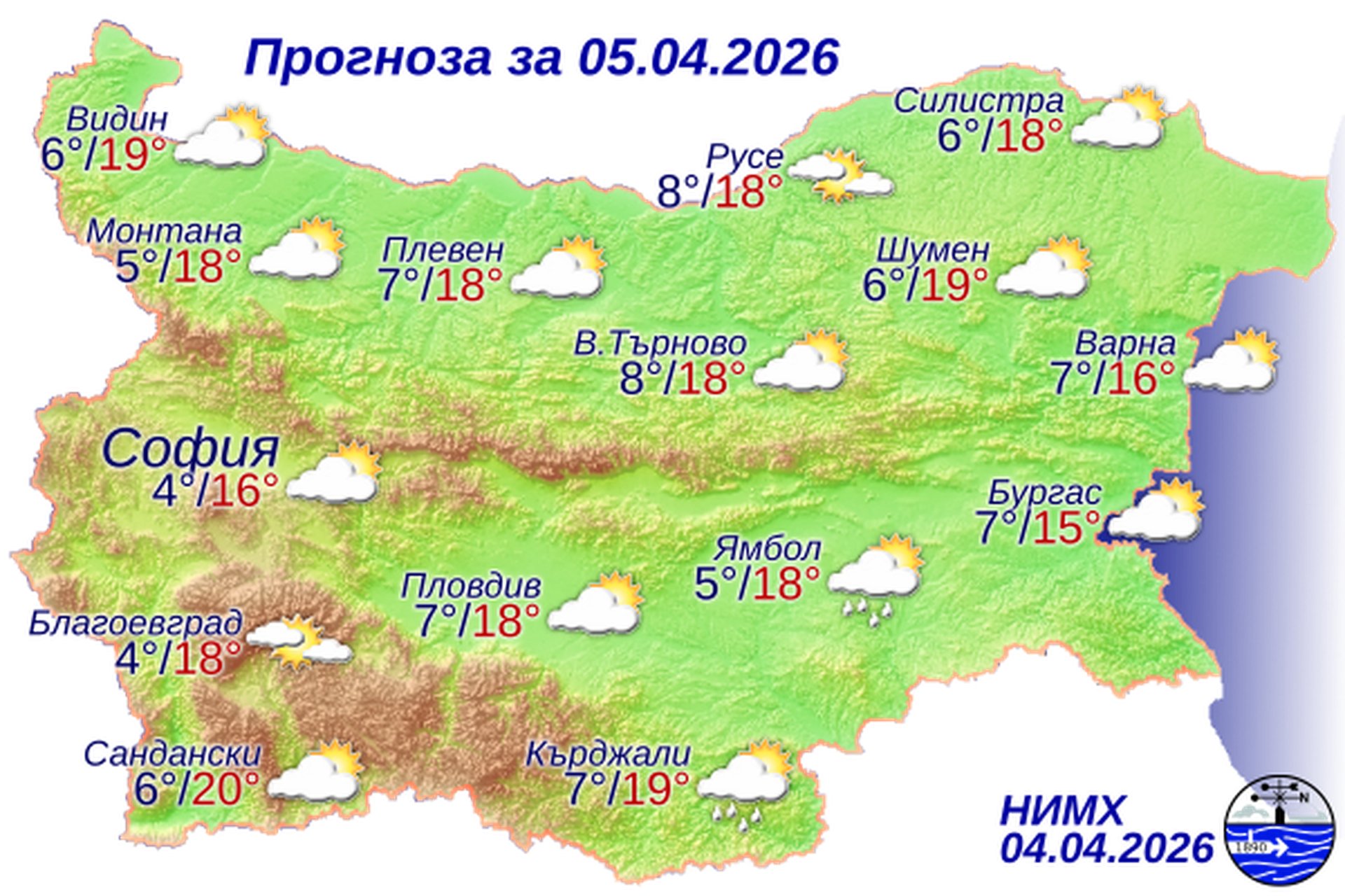 Днес ще бъде предимно слънчево. Около и след обяд ще се развива купеста облачност. На отделни места, главно в планинските райони, ще превали краткотраен дъжд. Ще духа слаб, в Дунавската равнина и временно умерен вятър от запад-северозапад. Максималните температури ще бъдат между 15° и 20°, за София – около 16°.