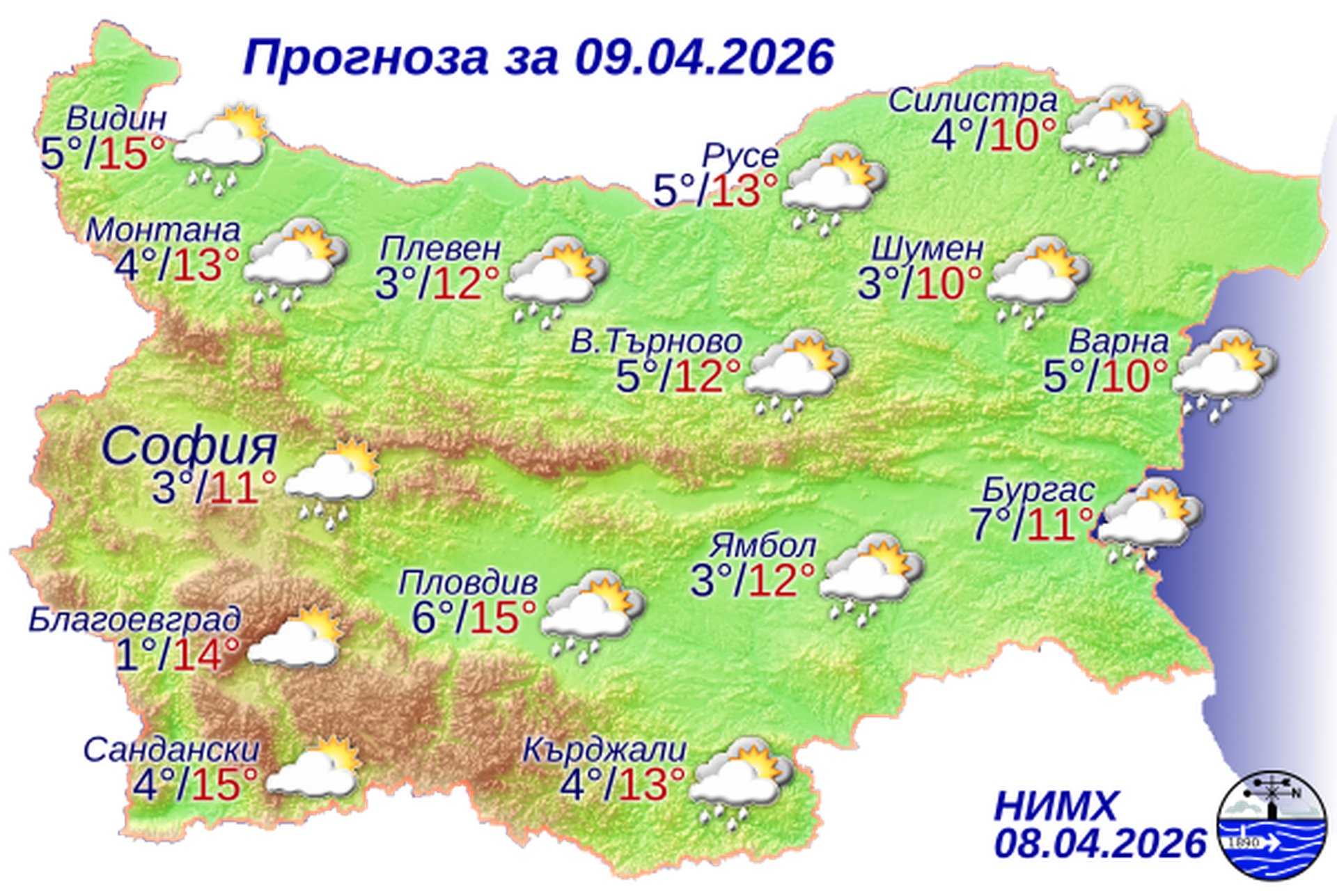 Утре облачността над страната ще е променлива, по-често значителна, на места със слаби валежи от дъжд. В сутрешните часове в отделни северни и планински райони дъждът ще се примесва и временно ще преминава в сняг. Почти без валежи ще е в крайните югозападни райони. Ще духа умерен, в Дунавската равнина, Горнотракийската низина и по поречието на Струма и Места временно силен северозападен вятър. Максималните температури ще са между 10° и 15°, в София – около 11°.