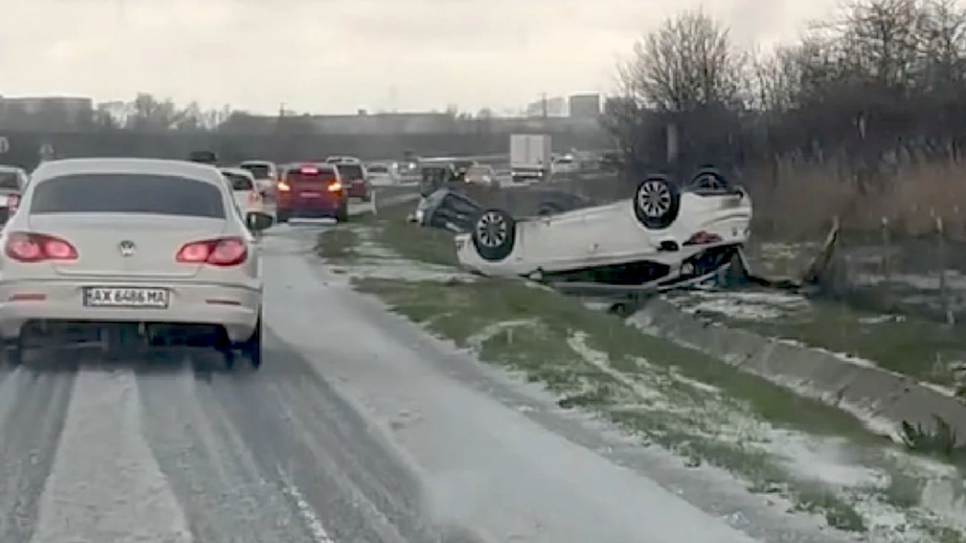 Малко преди 12 часа ледената буря за минути е превърнала пътната настилка в изключително хлъзгава, а видимостта рязко е намаляла.