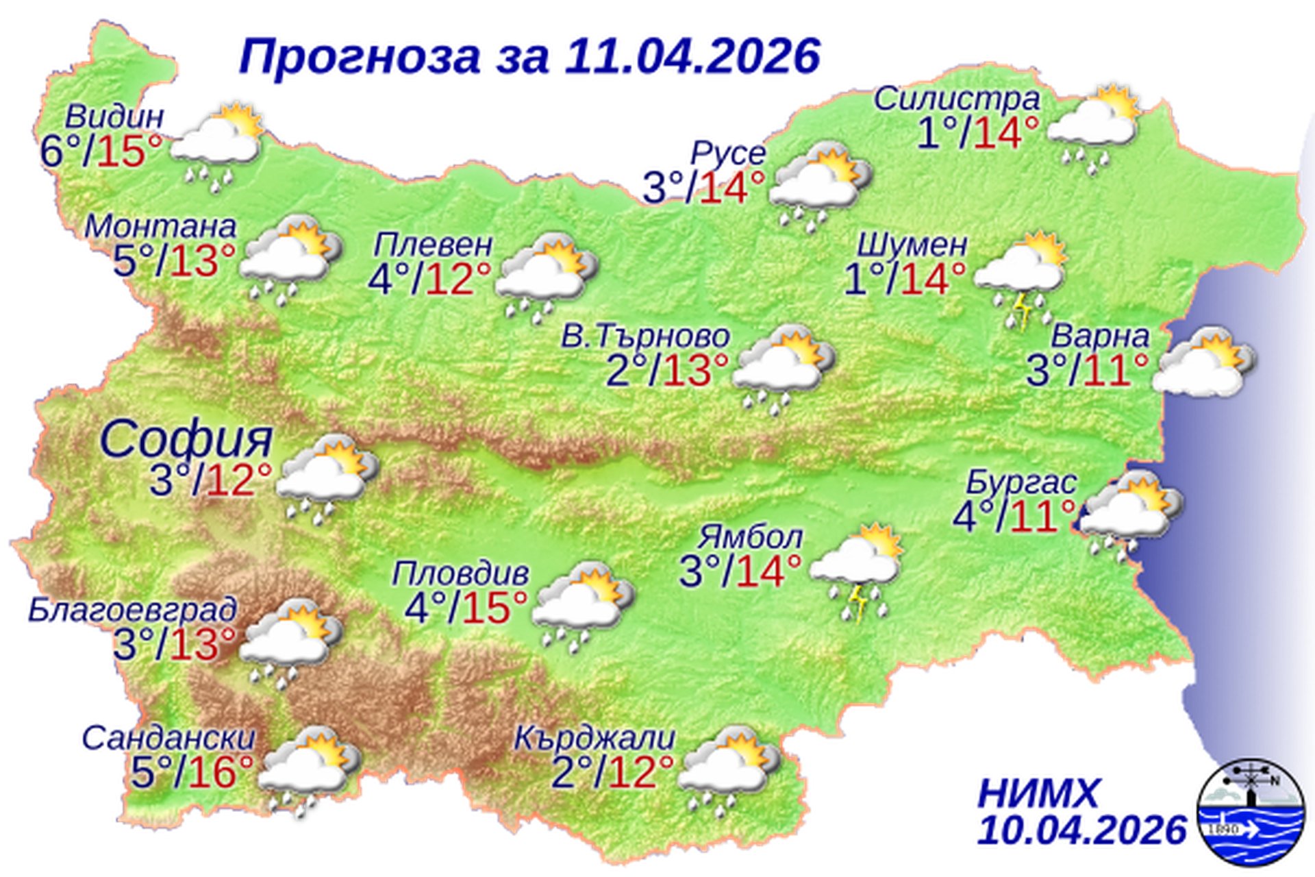 След временно намаление на облачността, през нощта отново ще се заоблачи. След полунощ в югозападните райони ще започне да вали дъжд, в планините – сняг. На много места вятърът ще стихне. В крайните североизточни райони ще има условия за слана. Минималните температури ще бъдат между 0° и 5°, за София – около 3°. Утре над по-голямата част от страната облачността ще бъде значителна. На много места ще има валежи от дъжд, в планинските райони – от сняг. В Източна България валежите ще бъдат придружени с гръмотевици. Ще духа до умерен вятър от запад-северозапад, в източните райони - от юг-югоизток. Максималните температури ще бъдат между 11° и 16°, за София – около 12°.