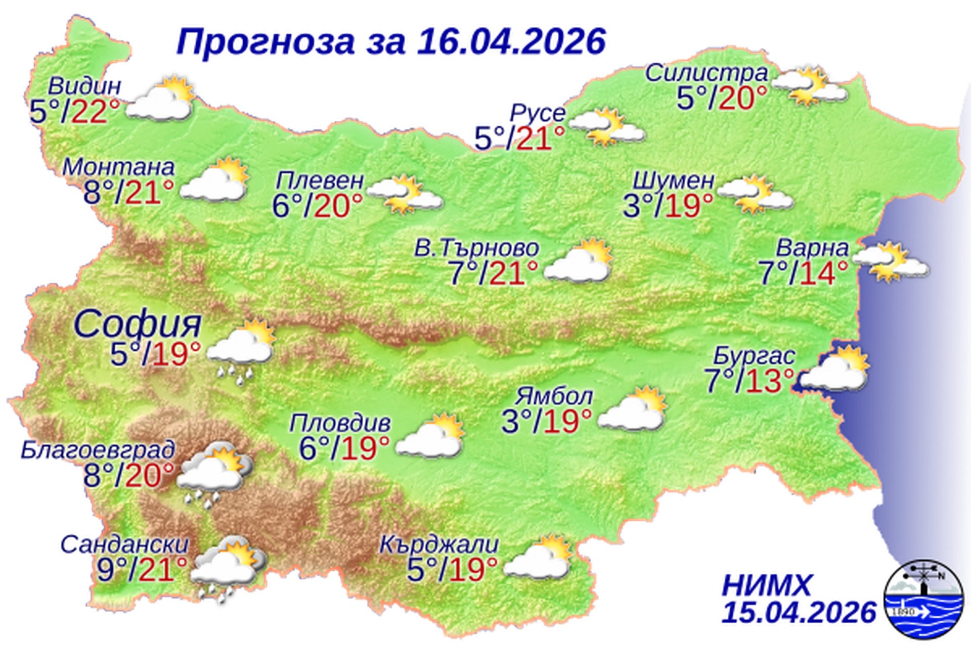 През нощта над по-голямата част от страната ще има значителна облачност, но след полунощ ще започне да се разкъсва. На отделни места, главно в югозападните райони, все още ще превалява. Ще духа слаб вятър от изток-югоизток. Минималните температури ще бъдат между 3° и 8°, в София – около 5°. Утре в по-голямата част от страната ще преобладава слънчево време. По-съществени увеличения на облачността ще има над Югозападна и Централна Южна България и на места там ще има слаби валежи от дъжд. Ще духа слаб до умерен вятър от изток-североизток. Максималните температури ще бъдат между 16° и 21°, в София – около 19°.