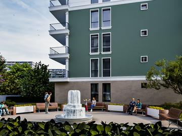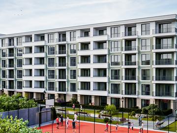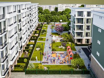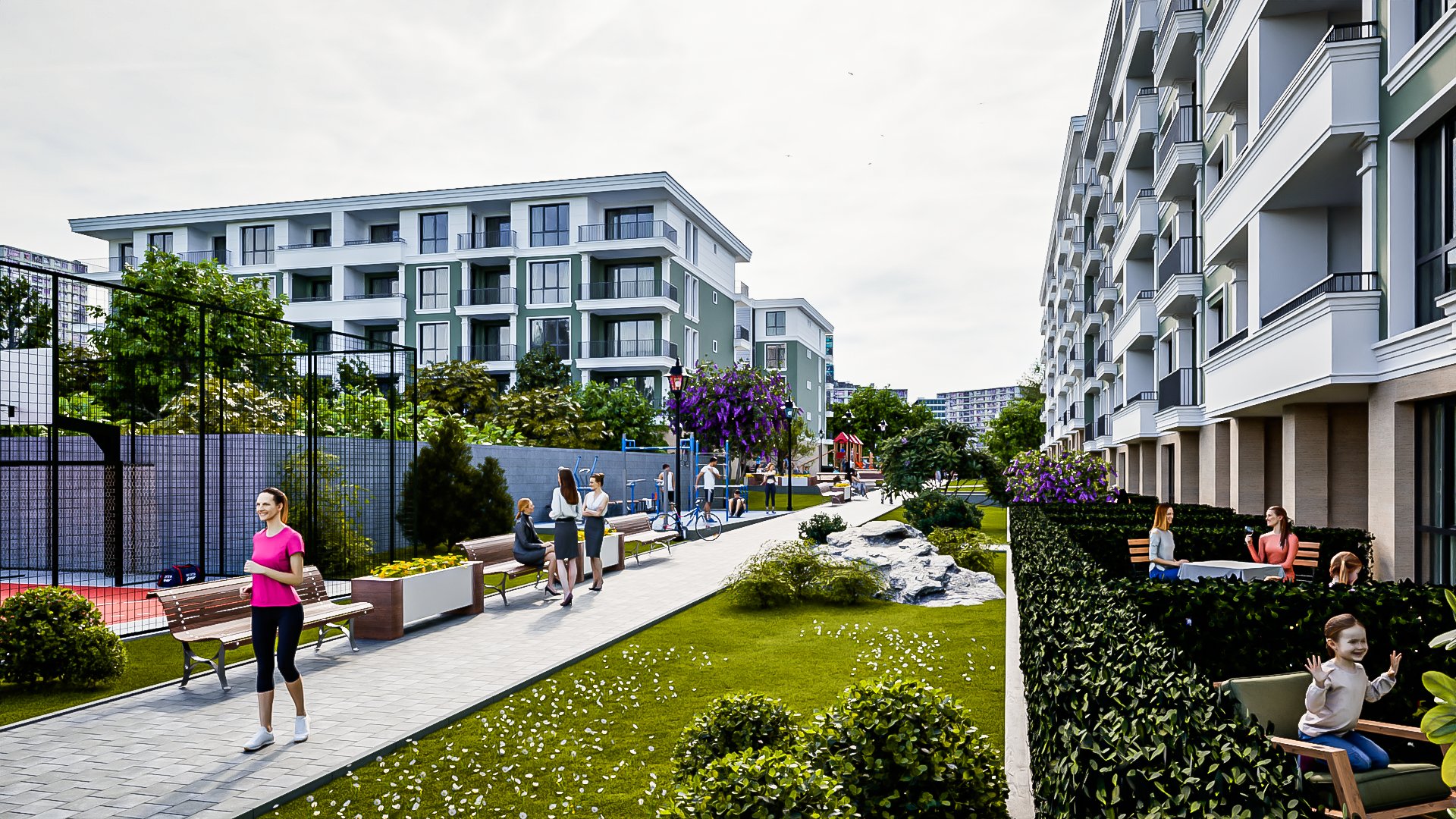 Вътрешният двор на комплекса е проектиран с мисъл за общността. Забравете за тесните тротоари – тук фокусът е върху движението и социализацията.