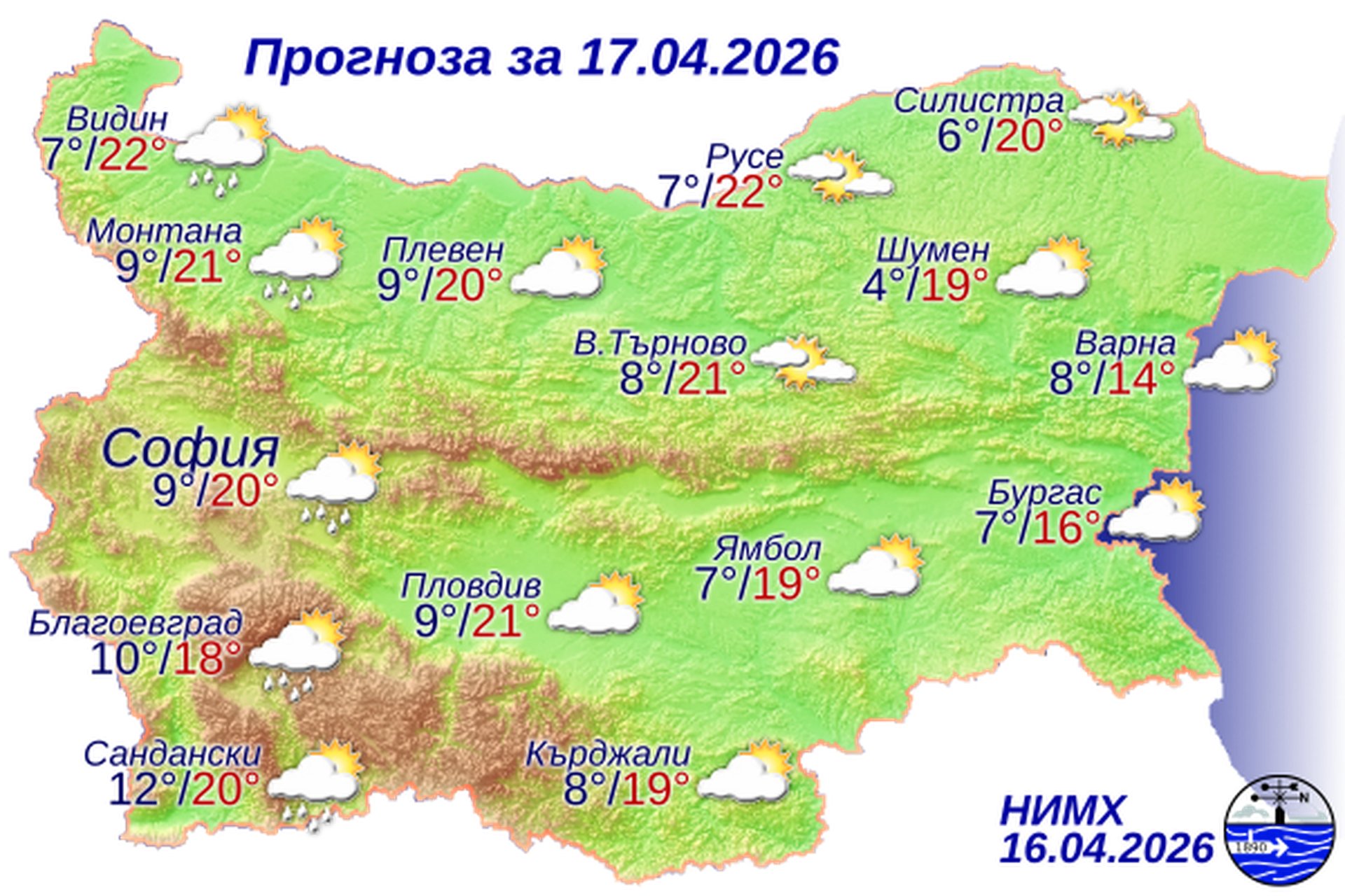 Утре облачността над страната ще бъде разкъсана, главно над Южна България предимно значителна и на отделни места в югозападните райони ще има превалявания от дъжд. Привечер от северозапад облачността ще се увеличи и ще започнат валежи от дъжд. Ще духа слаб до умерен вятър от изток-североизток. Максималните температури ще бъдат между 17° и 22°, по-ниски по Черноморието, а в София – около 20°.