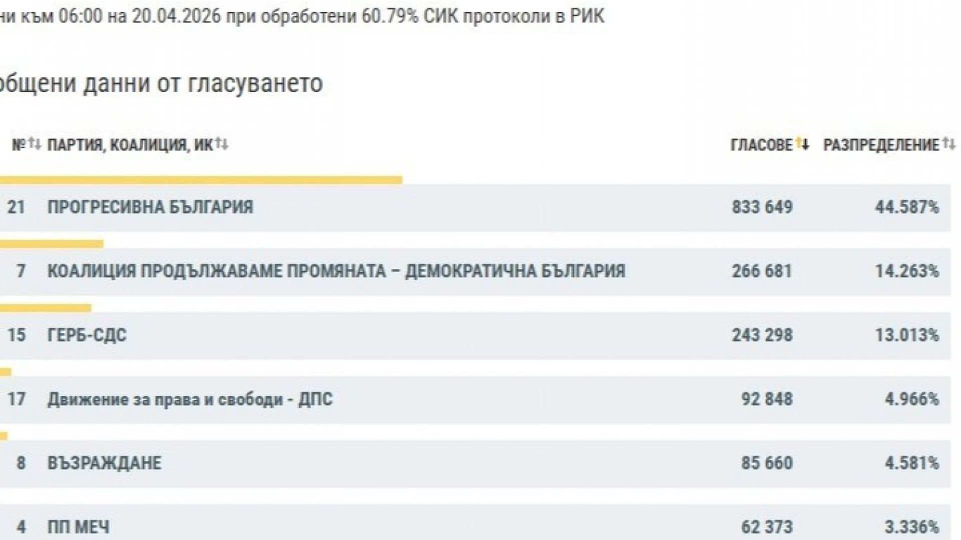 Към 6:00 часа тази сутрин Централната избирателна комисия (ЦИК) публикува на своя сайт междинните резултати от вота при 60,79% обработени протоколи на секционните избирателни комисии (СИК) в районните избирателни комисии (РИК).