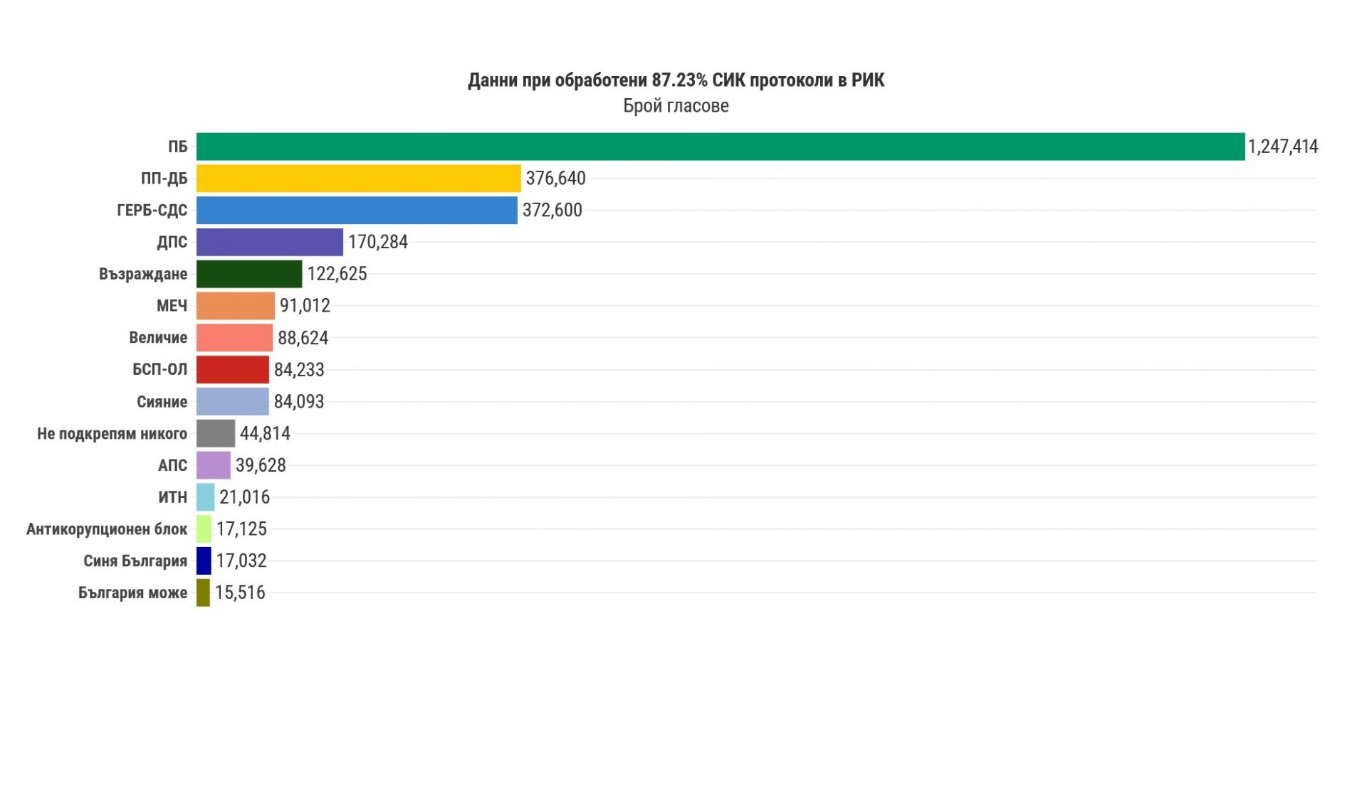 Формацията на Румен Радев вече постигна почти милион и четвърт от гласовете в своя актив и постига към момента 44, 564%. За ПБ са гласували 1 247 417 избиратели.