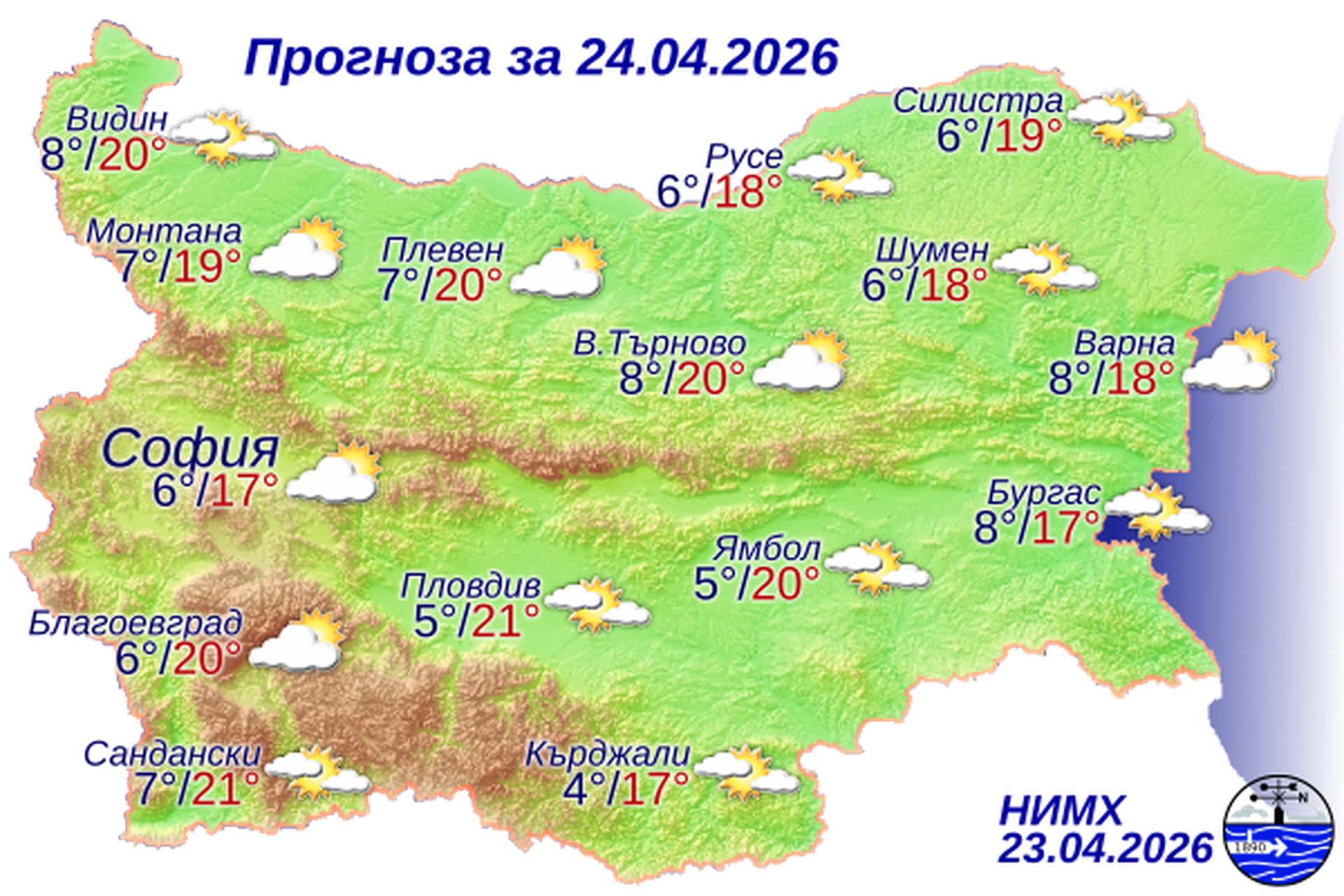 По Черноморието облачността ще е променлива, намаляваща до предимно слънчево. Ще духа умерен, временно силен вятър от запад-северозапад. Максималните температури ще бъдат между 14° и 17°. Температурата на морската вода е 12°-13°. Вълнението на морето ще бъде 2-3 бала.