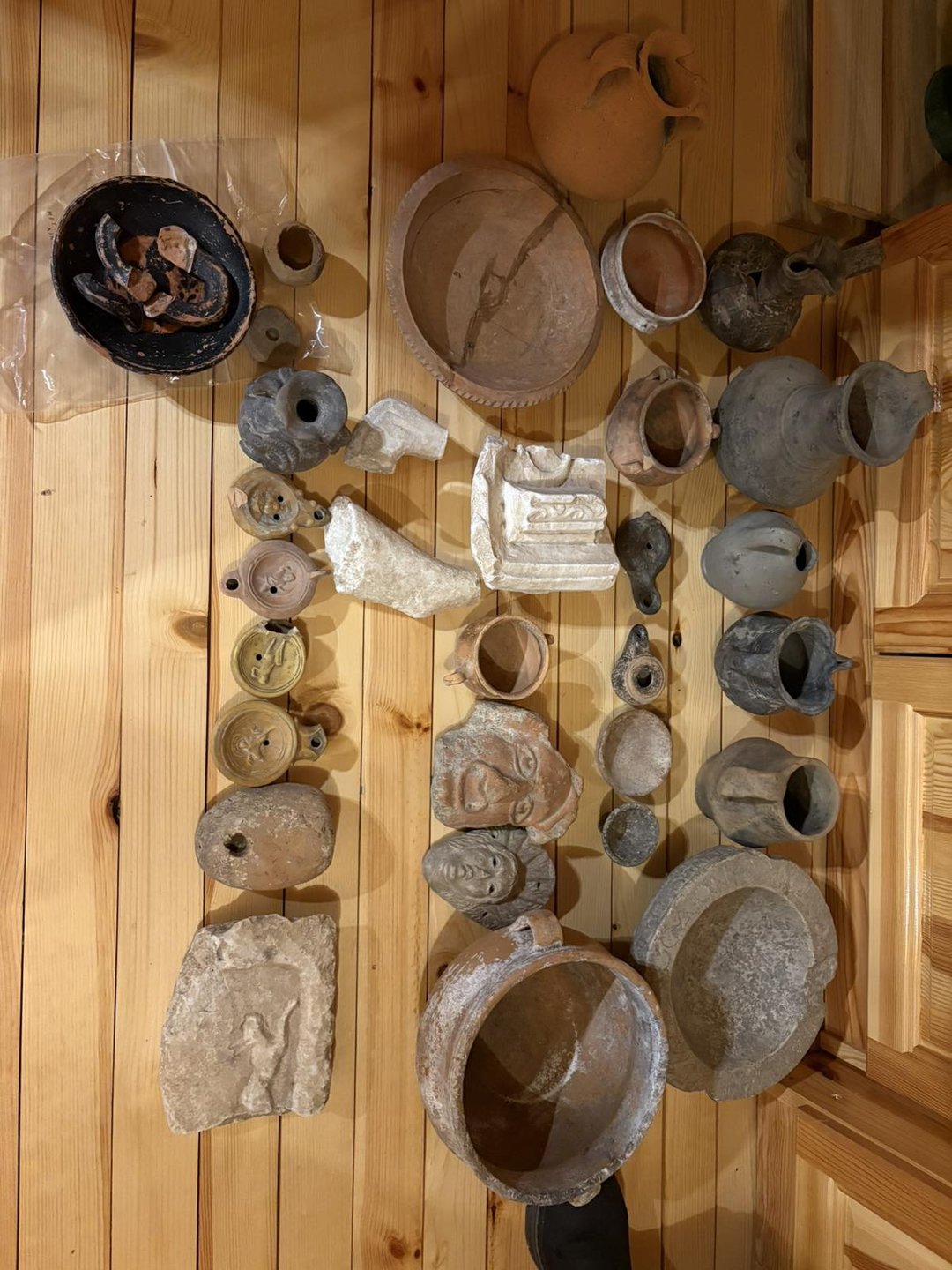 Криминалисти отишли вчера по сигнал в къщата на 64-годишен мъж от селото. Намерили керамични съдове, керамични лампи, фрагменти от оброчна плочка, мраморни фрагменти от облицовка, керамични маски, както и мечове със съвременно изработени дръжки.