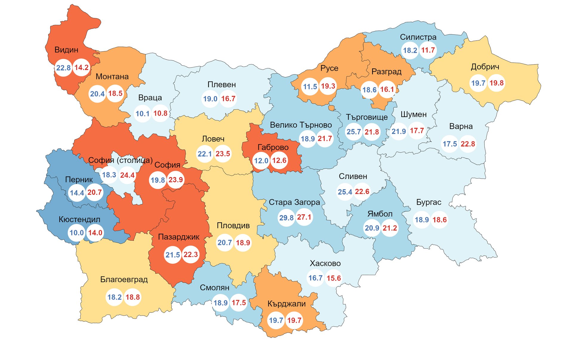 От картата излиза, че във Врачанско и в Кюстендилско са най-богати. Което не го вярвам. И в двете области населението намалява и се изнася да работи в София. Истината е, че представата за бедност е различна, а и измерването не е комплексно, за да е долу-горе вярно.