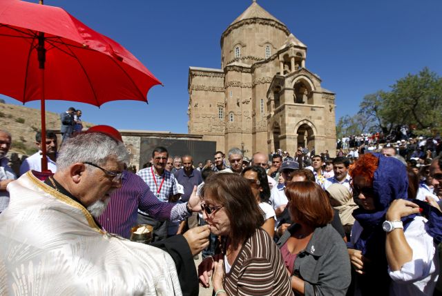 Корабчета кръстосваха сутринта по езерото Ван, за да транспортират поклонниците, дошли от Турция, Армения, Европа и САЩ, до остров Акдамар (Ахтамар на арменски), където се намира църквата Светия кръст, строена през Х век. Тя е едно от малкото свидетелства за многобройната арменска общност в османска Турция, станала жертва на убийствата и депортирането през Първата световна война. За Армения зверствата преди близо сто години са геноцид – определение, което Анкара категорично отхвърля. Турция разреши религиозната служба, организирана от малобройната арменска общност в страната, в опит за успокои напрежението и да заличи спомените от кървавото минало. В Армения не са малко гласовете, които определиха инициативата като ПиАр акция и дори призоваха за бойкотирането й. Недоволството бе предизвикано от факта, че турската страна не бе монтирала навреме за службата кръст на покрива на църквата, която днес има статут на музей. Властите обясниха това с административно забавяне. Кръстът – от метал, висок 2 м и тежащ 110 кг - е поставен върху дървен цокъл при входа на църквата, преди да бъде издигнат на покрива. /АФП