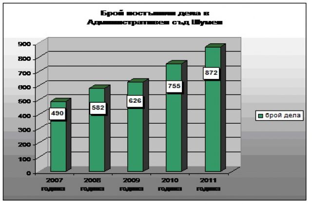 Новообразуваните дела в Шуменския административен съд /ШАС/ през 2011-та са 872, което е с 117 повече от предходната година. Тенденцията е за постоянно увеличаване на техния брой през петте години от създаването на специализирано административно правораздаване в страната. Това се казва в годишния доклад на ШАС, приет на годишно събрание вчера, на което са присъствали съдиите от Върховен административен съд Мариника Чернева и Йордан Константинов, както и председателят на Окръжния съд Нели Батанова и окръжният прокурор Ася Петрова.