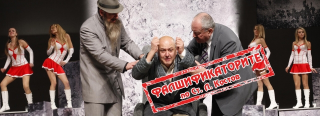 „Фалшификаторите” по „Вражалец” на Ст. Костов е постановка на Димитър Шарков. В пиесата играят Стефан Рядков и Илия Раев, както и Кольо Стайков, Таня Алваджиева, Мария Григорова, Милен Алексиев, Васил Грънчаров, Димитър Атанасов, Диа Мантова, Стефан Сотиров, Стефани Лечева, Кольо Михайлов, Валери Зарков и шуменски мажоретки.