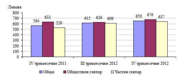 Спрямо същия период на 2011 г. средната месечна работна заплата през четвъртото тримесечие на 2012 г. в обществения сектор нараства с 6.8%, а в частния сектор - с 20.4% .