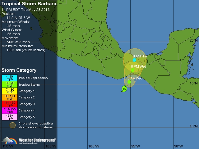 Засега "Барбара" е на около 200 километра югоизточно от мексиканския град Салина Крус. Скоростта в епицентъра на вихъра вече достигна 64 километра в час и според американската класификация явлението става "буря".
