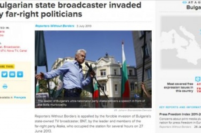 Организацията "Репортери без граници" осъди остро нападението, което "българската крайнодясна партия "Атака" се опита да извърши срещу обществената телевизия БНТ в края на миналия месец", се посочва в официална позиция на организацията, цитирана от френското издание ifex.org, цитирана от btvnews.bg.